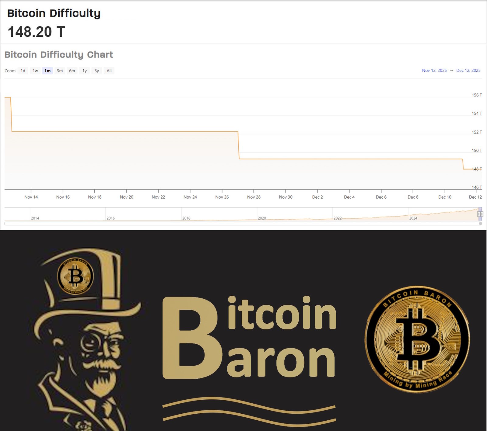 Der bisherige Höchstkurs beim BITCOIN-Mining lag im November bei über 157 T. Inzwischen ist es wieder deutlich leichter geworden, BITCOINS zu minen. Die DIFFICULTY ist jetzt zum 3. Mal gesunken, und liegt bei nur noch 148,20 T. Das macht das Produzieren von BITCOINS wieder deutlich leichter.