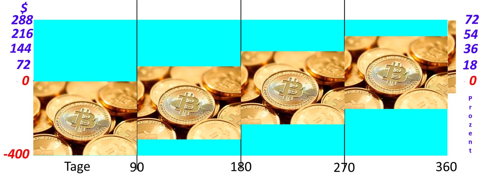 Betrachtet man hingegen den Wertzuwachs in Dollar, dann sieht das Ergebnis natürlich noch immer gut, aber schlechter aus, weil der Kursverlust sich auch bei den bereits produzierten BITCOINS auswirkt. Dadurch erhöhte sich der tatsächliche Wert aller vorhandenen BITCOINS, also nicht nur die im November produzierten BITCOINS, nur um ca. 200 Dollar. Das ist noch immer wesentlich besser als den Kapitalverlust, den die Spekulanten ertragen mussten.