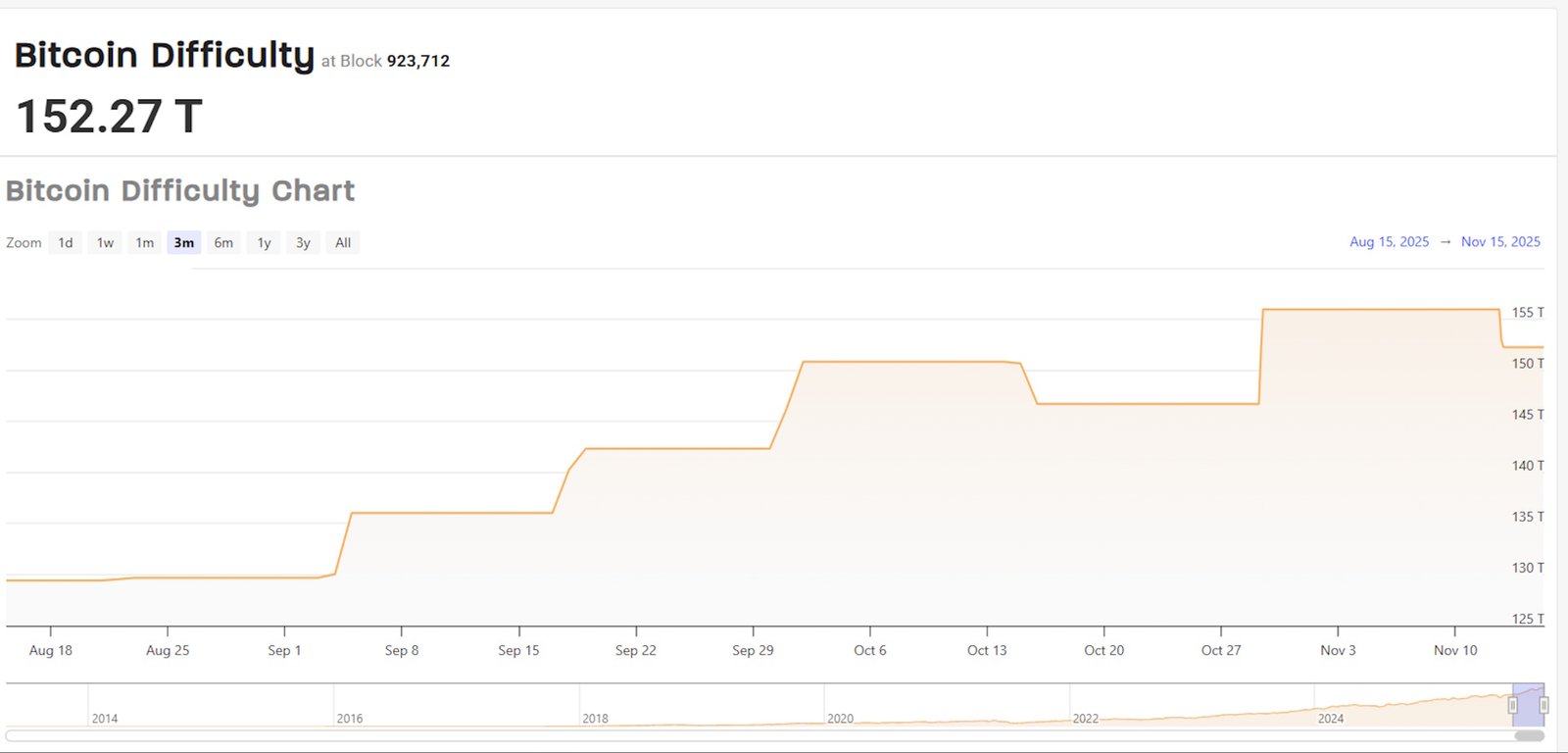 Ein weiterer Vorteil bei stark fallenden Kurs zeigt sich bei Mining bei der Entwicklung der DIFFICULTY. Die DIFFICULTY ist die Schwierigkeit der Aufgaben, die Miner erledigen müssen. Stark steigende Kurs des BITCOINS führen dazu, dass die Anzahl der Miner und der Rechenleistung, die BITCOINS produzieren, steigen, was dazu führt, dass die Erledigung der Aufgaben immer schwerer werden. Die Entwicklung der DIFFICULTY stieg bis zur letzten Woche auf einen absoluten Höchstwert von über 152. Eine hohe Difficulty führt dann dazu, dass die Miner immer weniger Erträge erzielen. Am 10.11. wurden pro 100 TH/s nur noch 0,000026 Bitcoins gemeint.