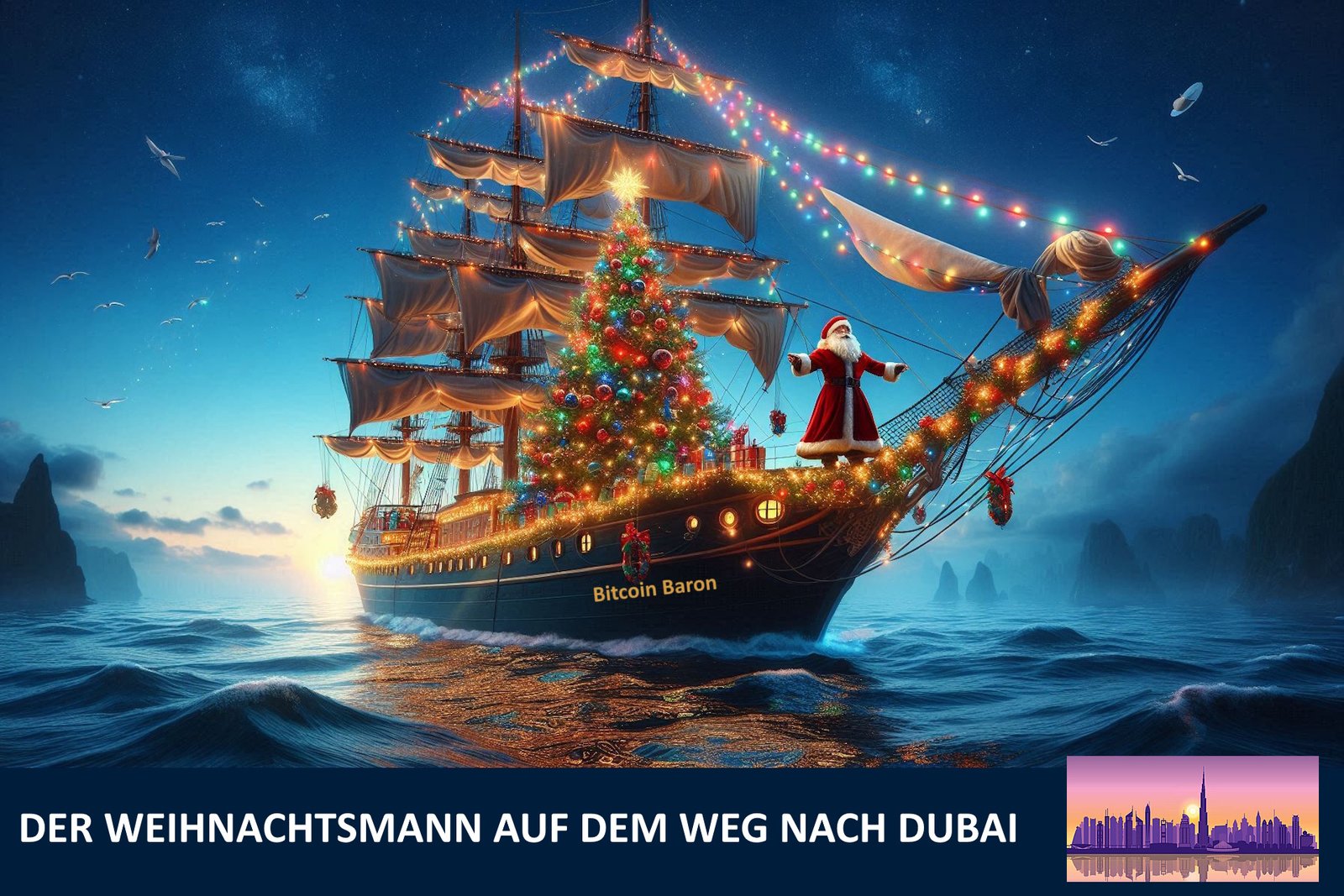 Wie wir gehört haben, hat sich der Weihnachtsmann schon auf den Weg nach Dubai gemacht. Er soll in diesem Jahr den Seeweg benutzen. Die KI hat uns dieses wunderbare Bild vom Weihnachtsmann auf dem beleuchtetem Segelschiff geschickt.